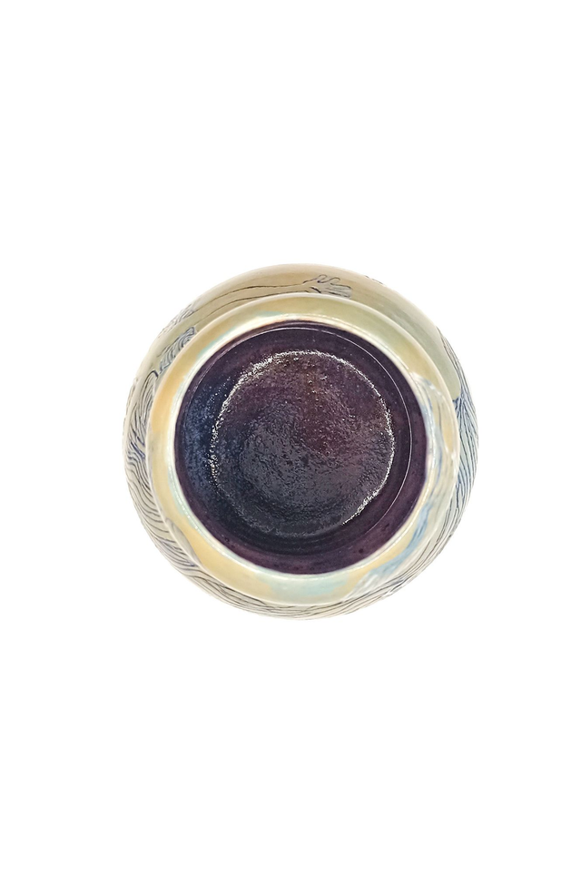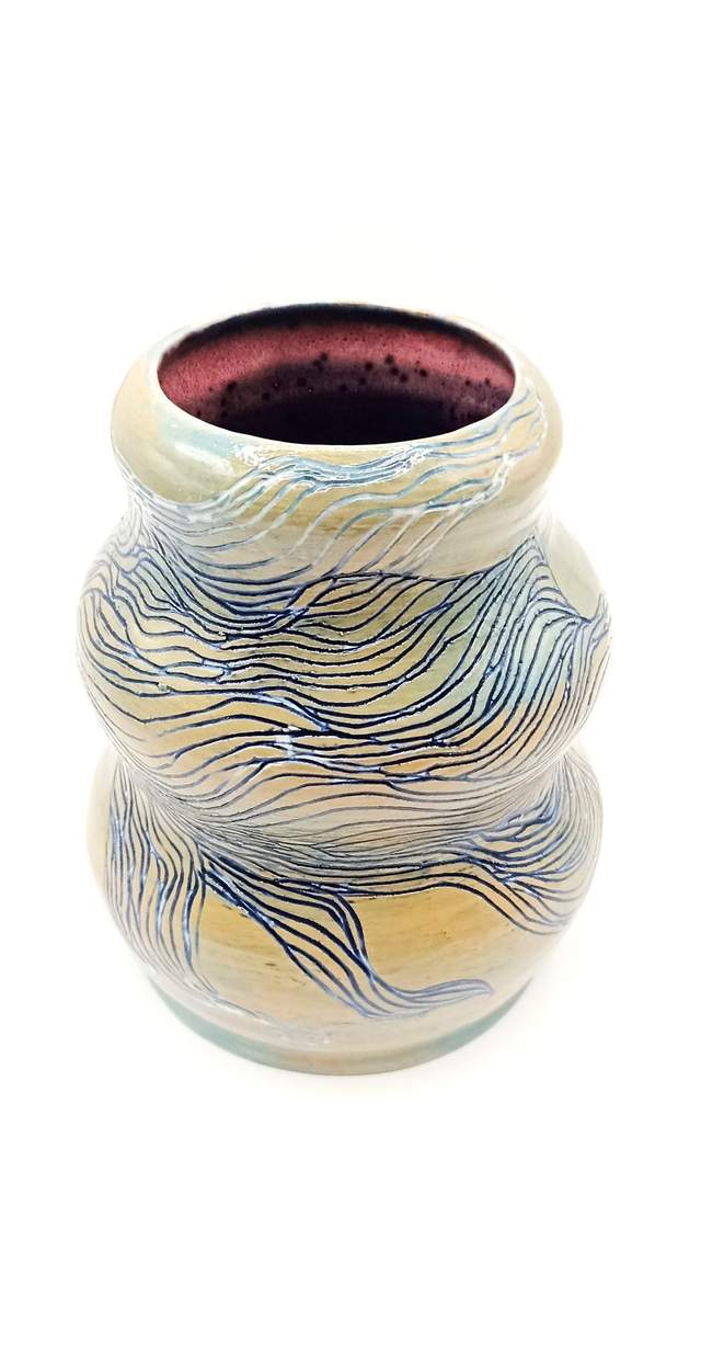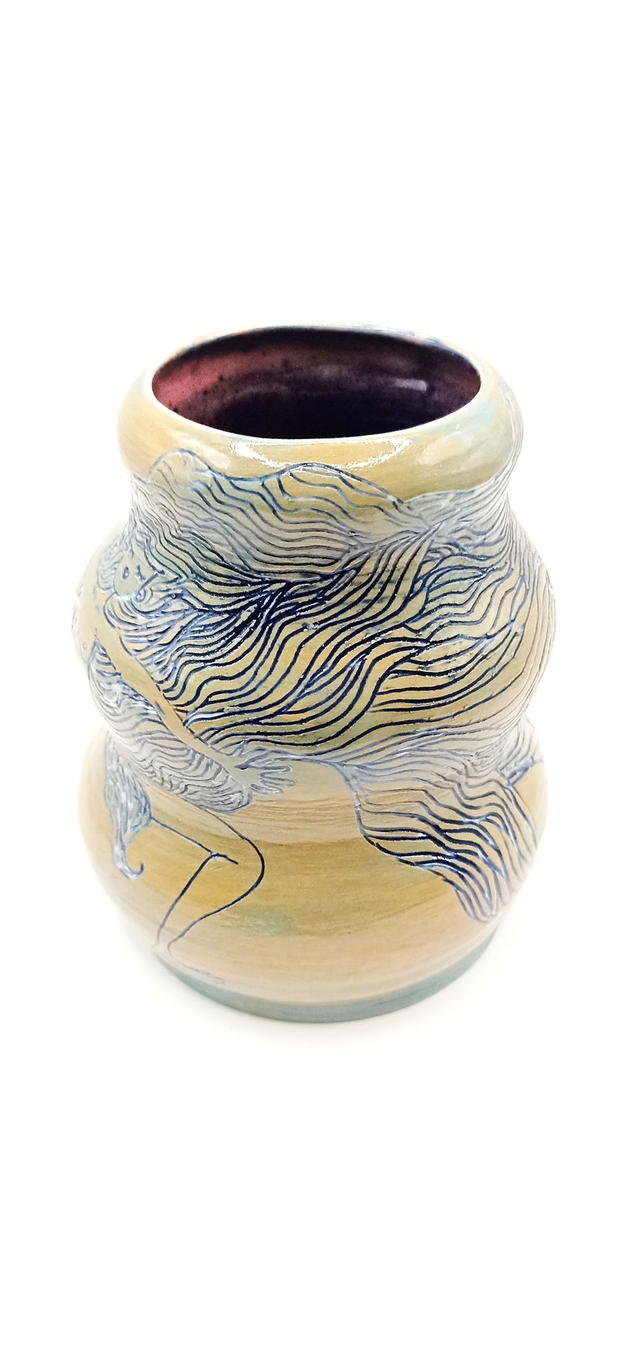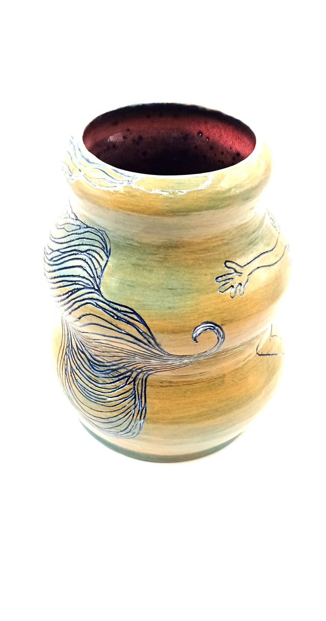 Elevate your space with this wheel-trown pottery vase featuring intricate sgraffito and carved decorations of a powerful singing woman. The unique design is complemented by a vibrant glaze inside, adding a touch of artistic flair to any decor. This piece handmade from stoneware clay is truly one of a kind. Perfect for adding a decorative touch to any room, this vase exudes freedom and beauty with the hair-like details all around. Bring a touch of creativity and elegance to your home with this exceptional and eye-catching piece.